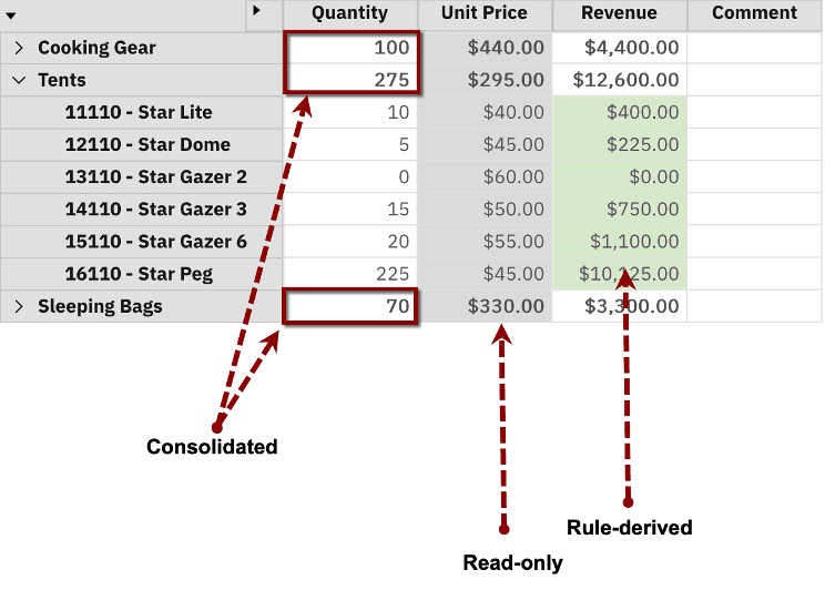In the legacy tools (Architect, Perspectives, and TM1Web) consolidated, rule-derived, and read-only cells were formatted with a grey background, while leaf (and string) cells were white. This clearly indicated the difference to a user and they would be making a conscious choice to enter a value into a consolidated cell.